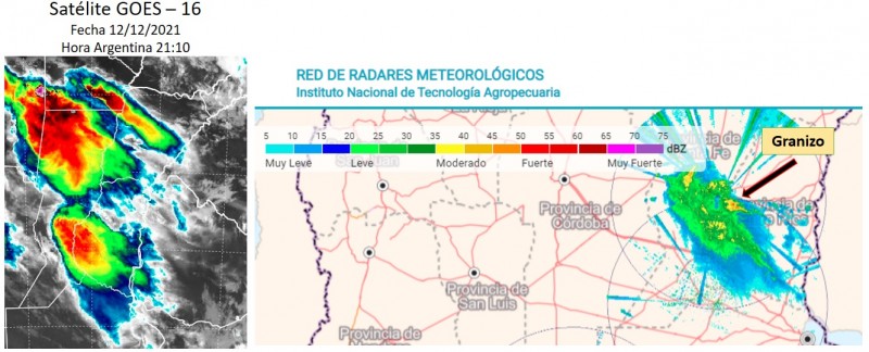 En la Figura 2 se puede visualizar el ingreso de la tormenta captada por el satélite Goes – 16 y las imágenes de la Red de Radares del INTA de las 21:10 horas.