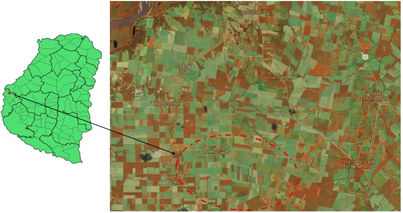El evento de granizo se focalizó dentro del distrito Palmar (Dpto. Diamante), en la Figura 3 obtenida del satélite Sentinel 2 correspondiente a la primera semana de diciembre, se detectan fácilmente lotes de maíz de primera (tonalidades rojizas) que ya cuentan con una buena cobertura, mientras que los lotes sembrados con soja de primera y segunda todavía no pueden ser detectados debido al escaso desarrollo.