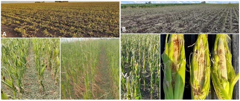 En la Figura 4 se presentan imágenes enviadas por nuestros Colaboradores que dan evidencia de los graves daños registrados en lotes con cultivos de maíz de primera y soja de primera, aunque también hubo reportes de daños en soja de segunda.