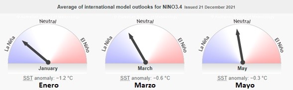 Promedio de las perspectivas del modelo internacional para NINO3.4 Emitido el 21 de diciembre de 2021 (Figura 2).