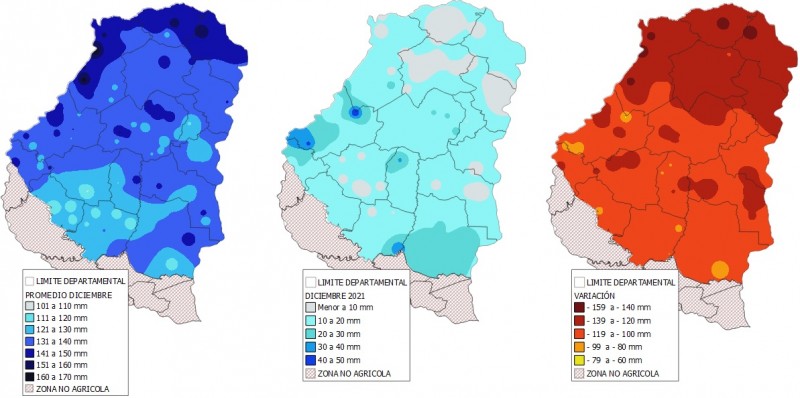 A nivel regional, la precipitación promedio de diciembre se ubica en 130 mm, el año 2021 el promedio se ubicó en 16 mm, es decir que se registró una merma del 88 % (114 mm).