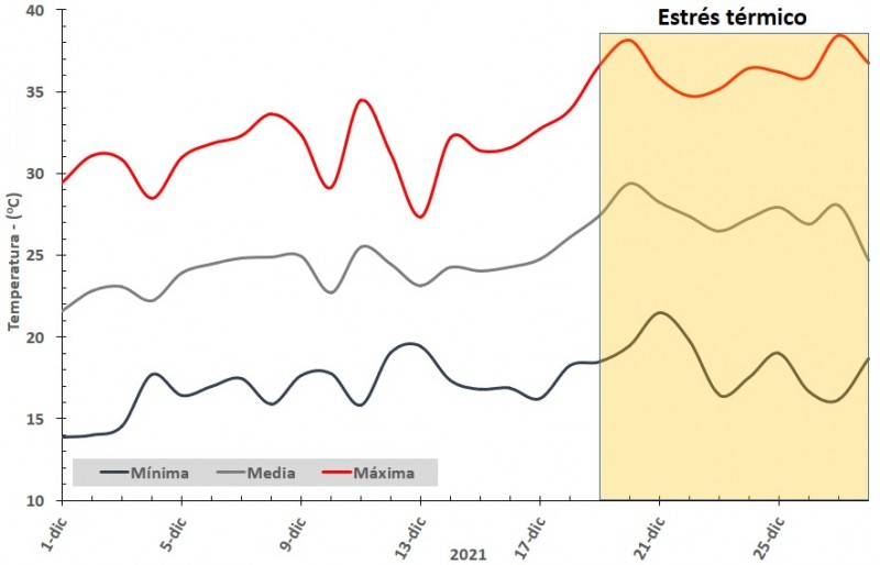 En la Figura 3 se observa que a partir del domingo 19 la temperatura máxima se ha posicionado en valores superiores a los 35 oC, lo cual indica una situación de estrés térmico para los cultivos.