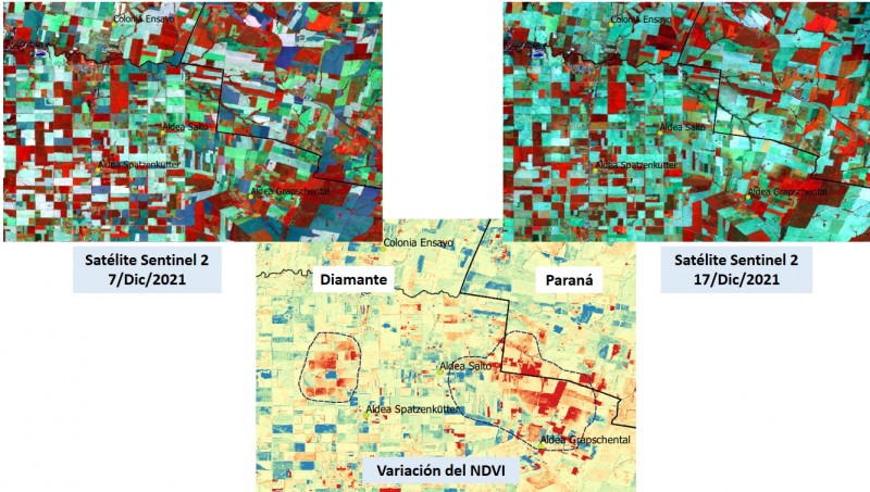 En estos sectores se aprecia pérdidas totales de lotes de maíz de primera (lotes visibles en color rojo en la variación del NDVI). Además, hay severos daños en lotes de soja de primera y segunda, pero debido a la escasa cobertura al momento del evento no pueden ser detectadas por el satélite.