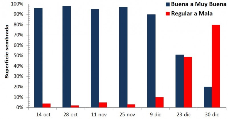 En la Figura 6 se muestra la evolución del cereal, donde a partir de los primeros días de diciembre la condición regular a mala comenzó a incrementarse pasando del 10 al 80 %.