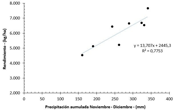 En base a un análisis de regresión que contempla la precipitación acumulada del bimestre noviembre – diciembre en los últimos ocho años da un rango de rendimiento estimado a nivel provincial entre 3.500 a 4.500 kg/ha. De concretarse sería el segundo rendimiento más bajo de las últimos 20 años. Figura 8.