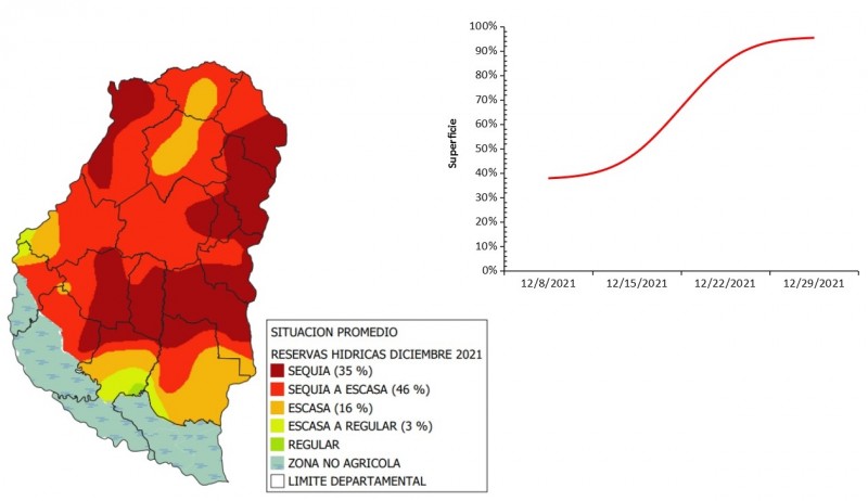 La siguiente imágen muestra la situación promedio de las reservas hídricas en el mes de diciembre y la evolución del área en situación de sequía, Figura 3.