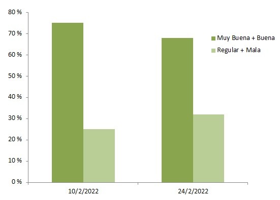 En la Figura 2, donde se detalla la variación de la condición con respecto a la anterior evaluación (10/02/2022), se observa una caída del 7 % tanto en las categorías muy buena + buena como en la regular + mala.