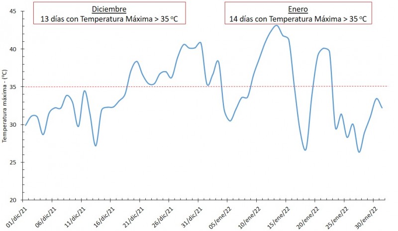 Por otra parte, el marcado déficit hídrico se combinó con temperaturas máximas extremas. En el bimestre diciembre – enero se registró un total de 27 días donde la temperatura máxima superó los 35 oC (Figura 1).