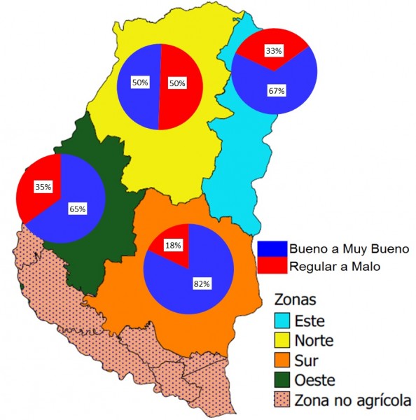 El sector Norte y Este posee entre el 52 al 58 % del cultivo en la condición de buena a muy buena, mientras que en el Oeste y Sur los valores ascienden y se posicionan desde 62 al 70 %.