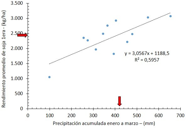 En la Figura 2 se muestra la correlación entre la precipitación acumulada desde febrero a marzo y el rendimiento esperado a nivel provincial en la soja de primera.