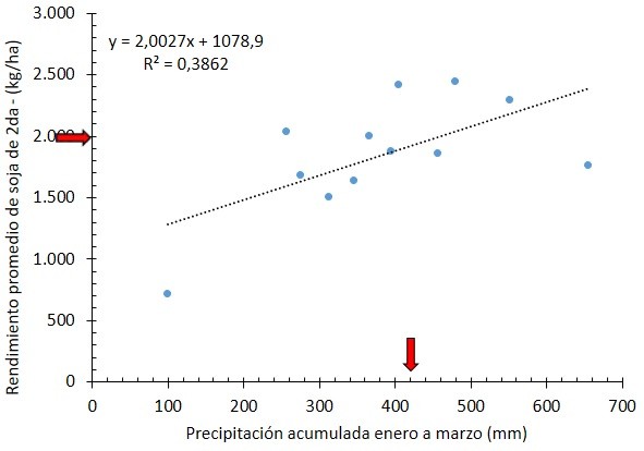 En la Figura 3 se muestra la correlación entre la precipitación acumulada desde febrero a marzo y el rendimiento esperado a nivel provincial en la soja de segunda.