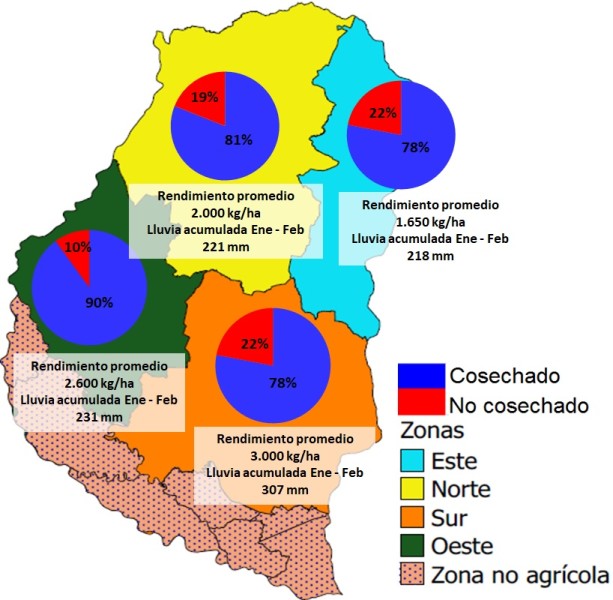En la Figura 1 se muestra el avance en la cosecha, el rendimiento promedio y el promedio de la precipitación acumulada del 01/Ene al 28/Feb del 2022 por zonas en la provincia de Entre Ríos.