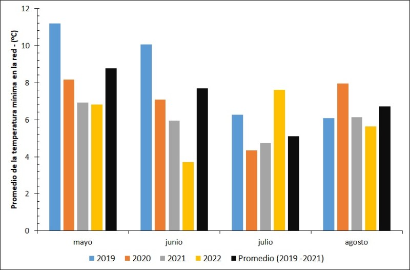 – El promedio de la temperatura mínima de mayo a agosto para los últimos tres años fue de 7,1 oC versus el valor de 6 oC que se registró en el 2022, es decir una disminución de 1,1 oC.