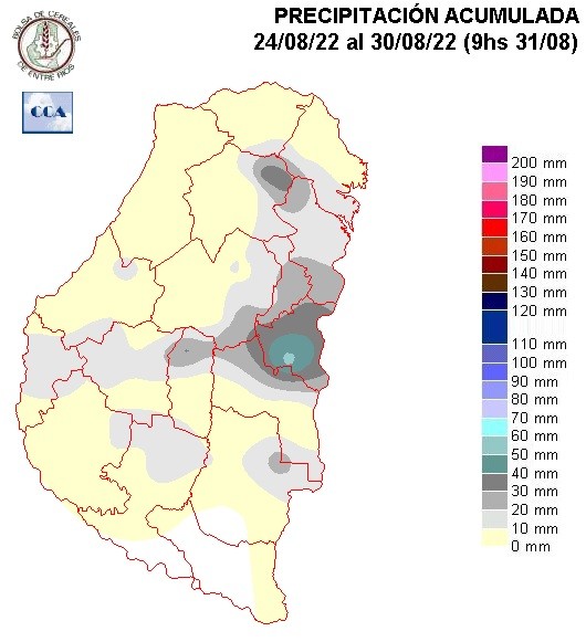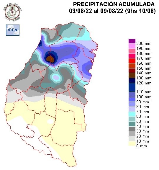 Durante el jueves y el viernes de la semana pasada, las lluvias se presentaron en gran parte del territorio provincial, pero sólo sobre el centro este de la provincia las mismas resultaron con un nivel significativo. Como puede observarse en el mapa, durante este evento, algunos corredores se extendieron hacia el oeste y hacia el noreste de la provincia, configurando áreas con lluvias que quebraron el techo de los diez milímetros, pero en el resto de los departamentos, predominaron las lluvias muy modestas. Justo en el cierre pluvial del mes de agosto (9hs de hoy), se observaron algunas lluvias, las cuales no corrigen la deficiencia mensual que predominó más que nada en el sur de la provincia.