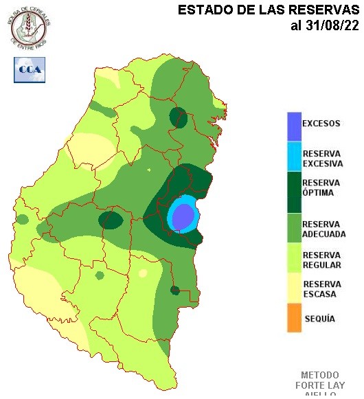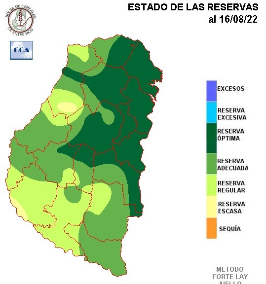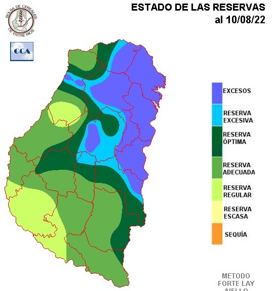 El balance hídrico al día de ayer, aun responde con algunos excesos en el departamento Colón, donde las precipitaciones han sido superiores a los cincuenta milímetros. Desde este máximo se desprenden corredores con reserva adecuadas hacia el oeste, norte y sur, pero como vemos, respecto de la semana pasada, el área con reservas regulares se ha expandido.