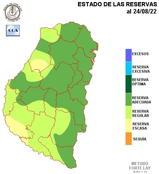 Con las precipitaciones que se están registrando hoy, las reservas regulares en las zonas agrícolas pueden crecer. No sabemos si los milimetrajes serán suficientes para lograr cambiar a la categoría regular, pero sin dudas son un paliativo esperado. Se mantiene de esta manera un comportamiento que se ha venido consolidando durante el invierno. Una secuencia de lluvias menores que, teniendo en cuenta la época del año y que aun los cultivos de la fina no potencian su demanda hídrica, resultan favorables como para que el estado de las sementeras sea bueno, posiblemente más ajustado en zonas del sur de Victoria y Gualeguay.