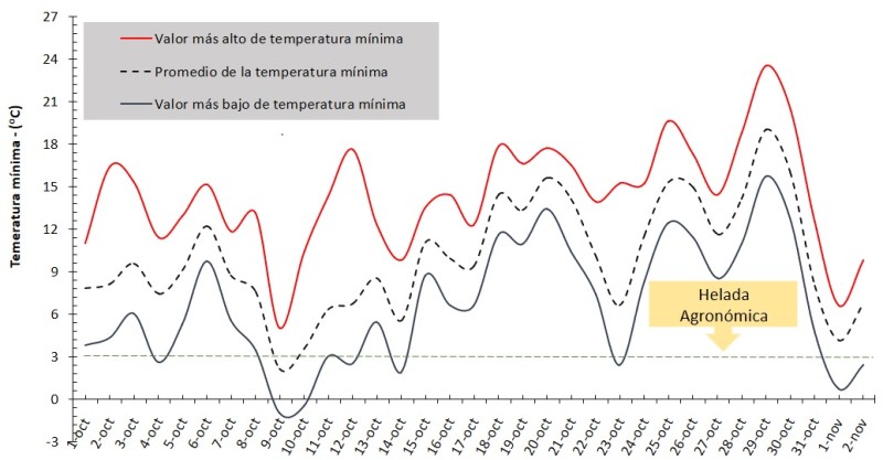 Por otro lado, el efecto de heladas tardías (Figura 3). La de mayor impacto se registró el domingo 9 de octubre con un promedio en la red de centrales meteorológicas automáticas de 2,1 °C, lo cual indica la ocurrencia de una helada agronómica (temperatura igual o inferior a 3 °C medida al abrigo, a una altura de 1,5 metros y que supone al ras del suelo una temperatura igual o inferior a 0 °C). Posteriormente se detectaron descensos térmicos de menor magnitud que, en sitios puntuales y dependiendo de la topografía seguramente llegaron al umbral de helada agronómica.