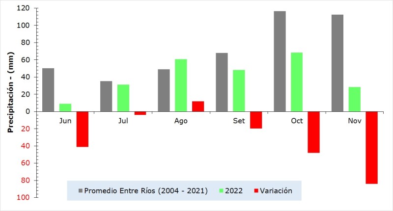 En la Figura 1 se presenta el promedio mensual de la precipitación de junio a noviembre y su variación en relación al año 2022. En Entre Ríos, la lluvia acumulada promedio entre junio y agosto es de 130 mm, mientras que en el año 2022 se registró una disminución del 23 % (30 mm). El déficit hídrico se agravó en la primavera. El monto acumulado normal entre setiembre y noviembre se sitúa alrededor de 300 mm, no obstante, en el 2022 se registró una caída del 52 % (155 mm).