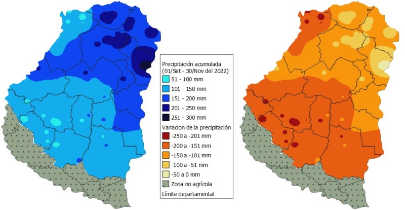 En la Figura 2 se muestra la distribución de la lluvia acumulada del 01/Set al 30/Nov del 2022 y su variación en relación al valor promedio esperado. El mayor déficit hídrico se registra en el centro Sur del territorio con una lluvia acumulada entre 101 a 150 mm, lo cual representa una disminución entre 151 a 200 mm.
