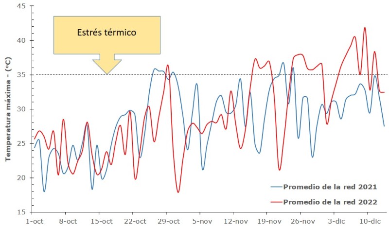 Al analizar las temperaturas máximas, se observa que en el año 2021, entre octubre y noviembre se registró un total de seis días con máximas superiores a los 35 oC, mientras que para el mismo periodo en el año 2022 el valor asciende a 19 días (Figura 2).