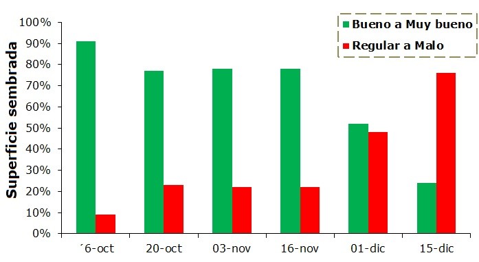 A nivel provincial, se implantó el 80 % del área planificada, lo cual evidencia un retraso del 20 % si se lo compara con lo concretado a esta altura del mes el año pasado y del 18 % en relación al promedio de avance de las últimas cinco campañas.