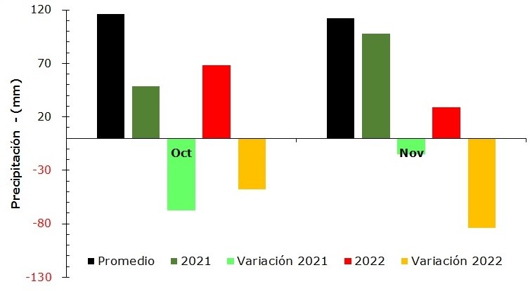 En la Figura 1 se muestra la variación de la precipitación promedio provincial de los meses de octubre y noviembre para los ciclos 2021 y 2022. La precipitación promedio en este bimestre se sitúa en 229 mm, el ciclo 2021 tuvo una caída del 36 % (82 mm), la cual ha sido superada por el ciclo 2022 que tuvo una merma del 58 % (132 mm).