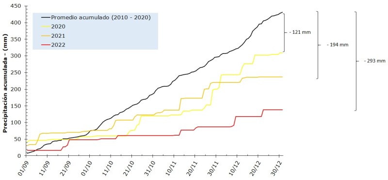 En la Figura 1 se muestra la precipitación acumulada promedio desde septiembre a diciembre durante el periodo 2010 – 2020 versus lo registrado en los últimos tres años.