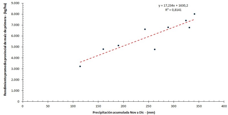 Una estimación realizada en función de la lluvia acumulada en el bimestre noviembre – diciembre arroja como resultado una perspectiva de 2.983 kg/ha (Figura 2)