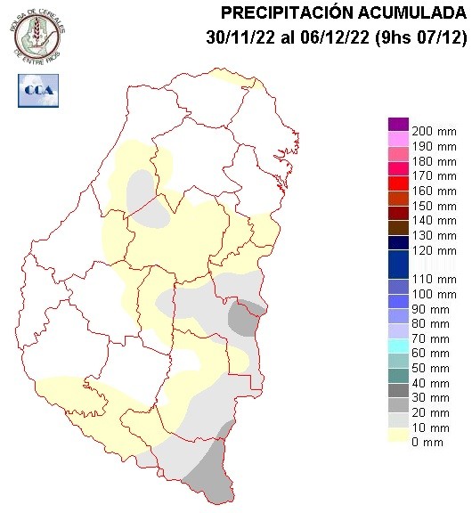 En el mapa las diferencias en la provisión de agua entre el este y el oeste son muy marcadas. Sin que los milimetrajes puedan considerarse generosos, en el este llovió mejor, con extendidos corredores donde los registros llegaron a casi treinta milímetros. Dentro de este contexto, aparecen máximos puntuales, destacándose el observado en el sur de Feliciano con casi setenta milímetros. En la zona central, se detectan algunas áreas mejor provistas en Tala y Villaguay, pero en general, estas lluvias más generosas se diluyen en registros muy modestos hacia el oeste.