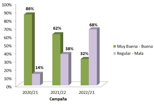 En la misma es muy visible que para igual fecha, el cultivo se encuentra en peores condiciones en el ciclo 2022/23, en el cual las categorias regular-mala suman un 71 % del área, a diferencia de las otras campañas, donde este valor esta muy por debajo.
