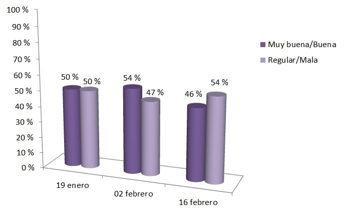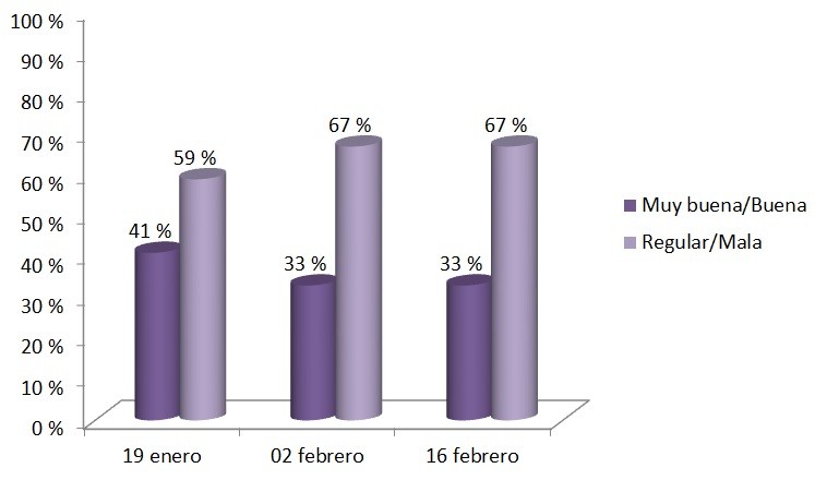 Se realizó la evolución de la condición en diferentes fechas a lo largo del ciclo. La misma se muestra en la Figura 2 y se observa que en promedio el 65 % del área se mantuvo dentro de una condición regular a mala.