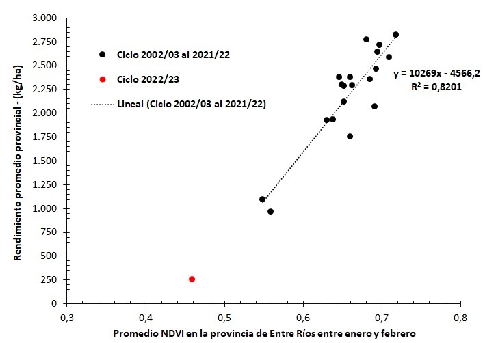 No obstante, el promedio de enero y febrero para el ciclo 2022/23 es de 0,46, para este caso, puede considerarse como una vegetación muy estresada y cercana senescencia.