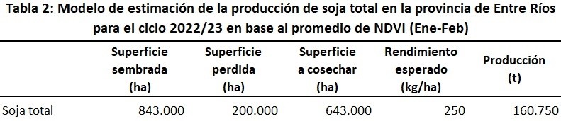 El rendimiento de indiferencia para la soja total es de 1.838 kg/ha, lo cual representa una pérdia por hectárea sembrada de 826 kg/ha. Esta estimación proyecta una pérdida total para Entre Ríos de 237.000.000 U$S.
