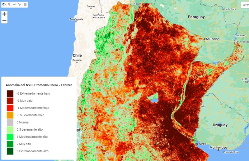 La Figura 1 muestra la anomalía del NDVI para los meses de enero y febrero del 2023 para el centro Norte de Argentina, donde se destaca la provincia de Entre Ríos con un dominio de valores extremadamente bajos.