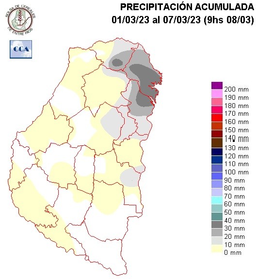 Con el avance de la primera semana de marzo las novedades de lluvia han sido muy pocas. La importante perturbación que transitó por el norte del país cambiando del viernes para el sábado, logró decantar algunas tormentas hacia el noreste del territorio entrerriano, donde se produjeron algunos eventos que pueden considerarse significativos. Sin embargo, esta situación no logró avanzar sobre el resto del territorio, donde los cielos cubiertos en forma dispersa fueron dejando algunas precipitaciones menores o en forma de llovizna. El escenario resultante es el predominio de una oferta que queda lejos de una recuperación significativa y promueve la continuidad de la sequía, claro está, mucho más allá de la provincia de ER.