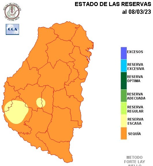 El mapa que representa la solución del balance hídrico cerrada la primera semana del mes de marzo, muestra retrocesos en las áreas donde se sostenían reservas algo más holgadas. Incluso zonas del noreste que recibieron hasta treinta milímetros, se mantienen dentro de la categoría más bajas de las reservas. El persistente patrón seco no cede y va promoviendo una situación que pone mucha presión sobre la indispensable recuperación pluvial del otoño. En general, el mapa exime de mayores comentarios y si bien puede haber áreas muy reducidas que ostenten algún nivel de reserva algo mejor, en términos de extensión es irrelevante. Debemos decir que lo que se ve para la provincia de ER, es extensible a toda la zona núcleo central del país y por estas fechas, sólo una parte del sudeste de BA escapa a la presión de este flagelo que ha recortado fuertemente la producción de toda la campaña 22/23.
