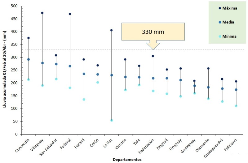En ningún departamento la lluvia promedio acumulada ha llegado al valor de 330 mm. El departamento mejor perfilado es Concordia, con promedio cercano a los 300 mm, pero se detectan sectores con valores mínimos de 210 mm y máximos de 375 mm.