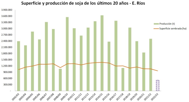 Considerando una superficie total sembrada de 969.500 ha y teniendo en cuenta alrededor de 200.000 ha perdidas, la producción total de soja en Entre Ríos para la campaña 2022/23 se estima en 512.000 toneladas. Lo que indica una caída interanual del 80 % en la producción.