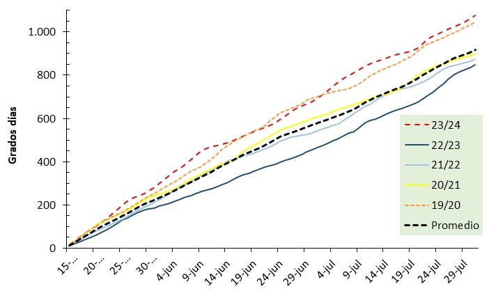 Con datos de la red de centrales meteorológicas, se calculó del 15 de mayo al 31 de julio, los grados días acumulados para los últimas cinco campañas. Además, se anexó el promedio entre los ciclos 2019/20 y 2022/23 (Figura 1).