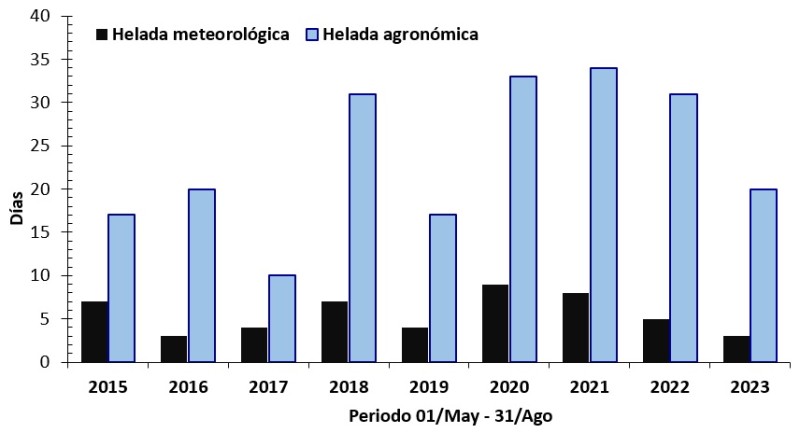 Por otra parte, el promedio de heladas agronómicas se posiciona en 24, mientras que, en el presente año, en el periodo analizado el total fue de 20.