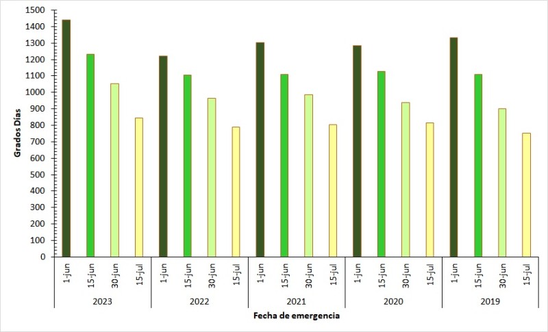 Para visualizar el impacto de la temperatura, en base a los datos aportados por la red centrales meteorológicas automáticas se muestra en la Figura 1 para los últimos cinco años, la cantidad de grados días acumulados en función de las siguientes fechas de emergencia: 1/Jun, 15/Jun, 30/Jul y 15/Jul.