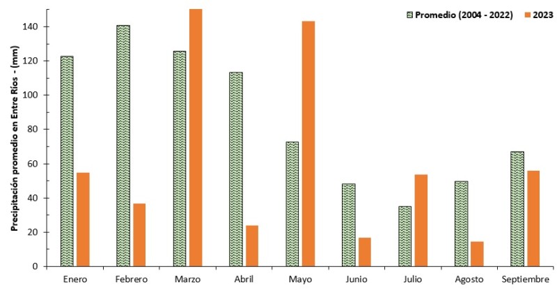 El monto de precipitación promedio acumulada para la provincia de Entre Ríos desde enero a septiembre es de 775 mm, no obstante, el año 2023 arrastra un déficit del 28 % (lo cual equivale a una merma de 215 mm).