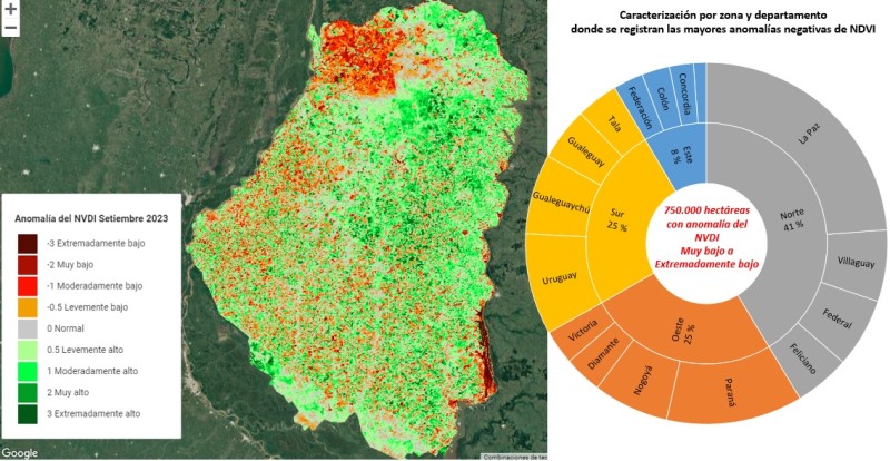 Si no se considera el área que abarca la zona del pre delta, la provincia cuenta con una superficie de aproximadamente 6.450.000 ha, de las cuales alrededor del 12 % (750.000 ha) en el mes de septiembre presentaron una anomalía del NDVI desde moderadamente a extremadamente bajo.