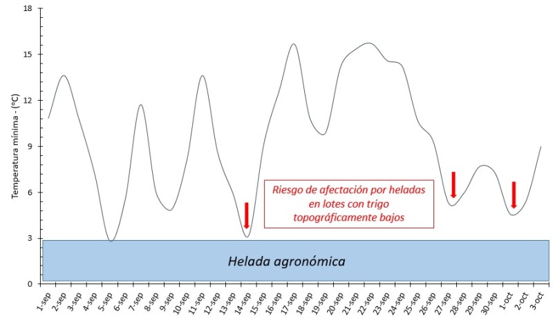 En la Figura 5 se muestra el comportamiento de la temperatura mínima en el promedio de la red de estaciones automáticas de BCER, si bien no se han registrado descensos térmicos importantes, ya que solamente el 05/Set la media se posicionó levemente por debajo de 3 oC (helada agronómica) se registraron tres días donde hubo leve descensos térmicos y que pudieron haber afectado al cereal, dependiendo la etapa fenológica y sobre todo la ubicación en el relieve.