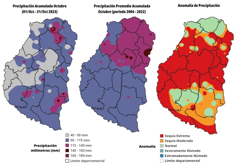 La precipitación promedio acumulada para la provincia de Entre Ríos desde enero a octubre es de 890 mm, por lo tanto, el acumulado en este periodo para el año 2023 presenta un déficit del 26 % (230 mm).