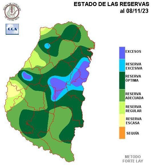 Al inicio de la siembra, septiembre a mediados de octubre, los departamentos ubicados en la costa del río Paraná presentaban reservas hídricas entre escasas hasta incluso un escenario de sequía, lo cual limitó el normal desarrollo de las labores. Cabe recordar que, en el ciclo 2022/23 los departamentos Paraná y La Paz abarcaron el 70 % del área total cultivada con la oleaginosa.