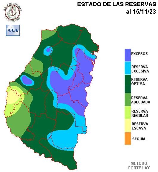 La semana ha transcurrido sin precipitaciones, o con eventos residuales de lluvias menores o lloviznas en los departamentos del norte durante el miércoles de la semana pasada. Esta ventana seca ha permitido un rápido encausamiento de los excesos hídricos hacia la red de arroyos, principalmente en el norte de la provincia. Además de este normal escurrimiento, el impacto de la radiación de estas fechas ya tiene un peso significativo, favoreciendo la pérdida de humedad superficial. A pesar de que el mapa muestra un retroceso de humedad significativo respecto de la semana pasada, la lectura que debe hacerse de las reservas es favorable debido a que los perfiles en profundidad han acopiado agua y tenemos por delante eventos pluviales que seguramente van a corregir los retrocesos superficiales recientes.