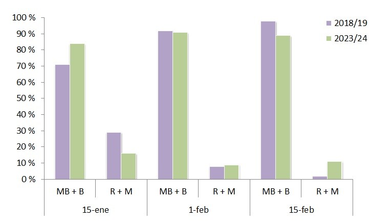 En la figura 1 se compara la evolución de la condición en tres fechas, para la campaña actual 2023/24 y la 2018/19, ámbas bajo los efectos climáticos de El Niño.