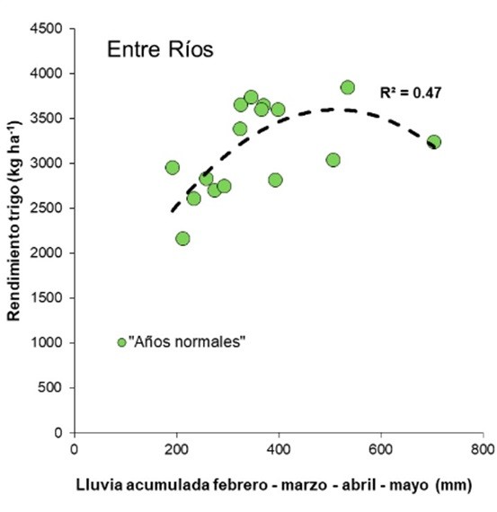 La regresión explica el 47 % de la variación del rendimiento del cereal en función de la precipitación acumulada desde febrero a mayo, donde para alcanzar alto rendimientos se requiere un acumulado de 400 mm aproximadamente.