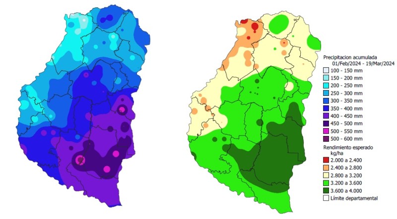 En la Figura 2 se muestra la precipitación acumulada del 01/Feb al 19/Mar del 2024 y el rendimiento esperado para el trigo con dicho valor.